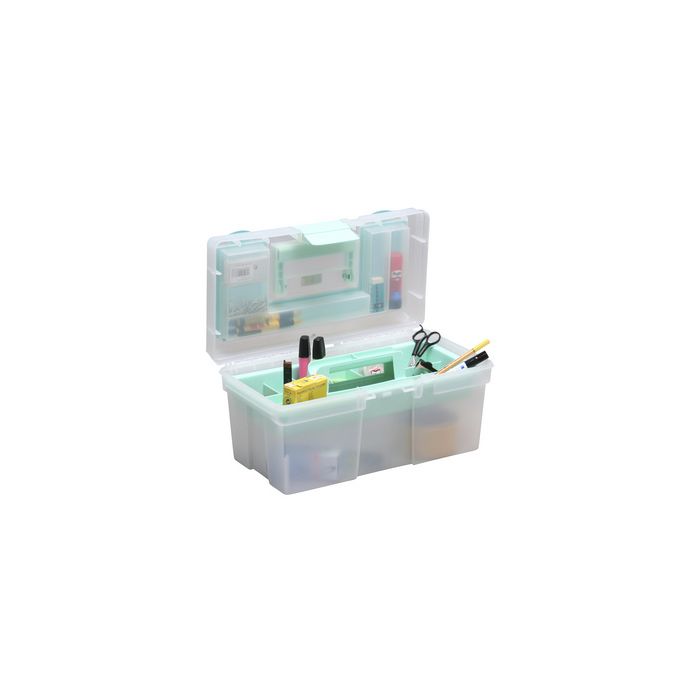 allit Boîte de rangement McPlus Clear 16, PP, vert en polypropylène, mallette transparente avec fermeture à clapet, poignée et plateau amovible de couleur rouge, boîte d'assortiment intégrée dans le couvercle, plateau avecporte-embouts et règle (cm/inch) amovible, (416413) dimensions : (L)400 x (P)220 x (H)200 mm