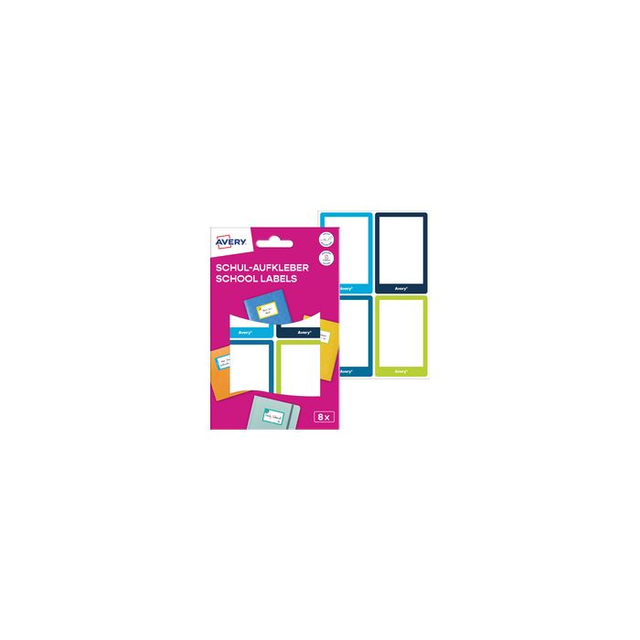 AVERY Étiquette pour livre, papier, 44 x 64 mm, cadre colorécoins arrondis, pour écrire à la main, adhésion permanente, blanc avec cadre coloré en rouge, bleu, vert et orange, pour étiqueter cahiers, livres et chemises contenu: 8 étiquettes sur 2 feuilles (SCHOOL8C) assortiment Back-To-School