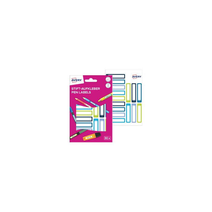 AVERY Étiquette pour stylo, papier, 10 x 50 mm, cadre colorécoins arrondis, pour écrire à la main, adhésion permanente, blanc avec cadre en bleu et vert, pour étiqueter les stylos et crayons de toutes sortes contenu: 30 étiquettes sur 2 feuilles (RESMI30G) assortiment Back-To-School