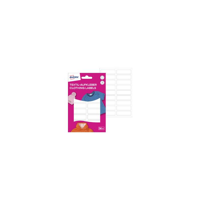 AVERY Étiquette pour textile, 13 x 45 mm, blanc en film vinyle, autoadhésif, pour écrire à la main, résiste au lavage en machine (jusqu'à 40 degrés), passe au sèche-linge, inscriptible avec marqueur permanent contenu: 36 étiquettes sur 2 feuilles (ETVET36) assortiment Back-To-School