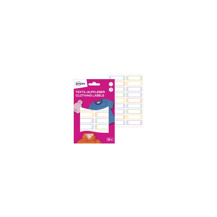 AVERY Étiquette pour textile, 13 x 45 mm, motifs en film vinyle, autoadhésif, pour écrire à la main, résiste au lavage en machine (jusqu'à 40 degrés), passe au sèche-linge, inscriptible avec marqueur permanent contenu: 36 étiquettes sur 2 feuilles (ETVET36M) assortiment Back-To-School