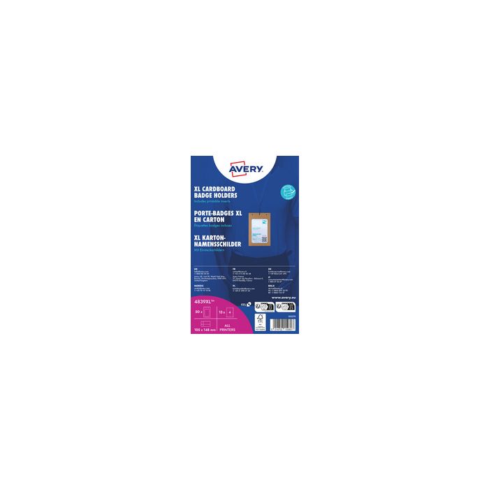 AVERY Pochette badge XL, en carton, 105 x 148 mm pochette badge en carton kraft et plastique, A6, étiquette: 190 g/m2, blanc, mat, imprimable, contenu: 50 pochettes badges et 13 feuilles de 4 étiquettes (4839XL)