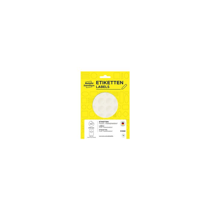 AVERY Zweckform Étiquette de fermeture, 18 mm, transparent adhésion permanente, rond, diamètre: 18 mm, en film transparent, étanche contenu: 720 étiquettes sur 15 feuille (51068)