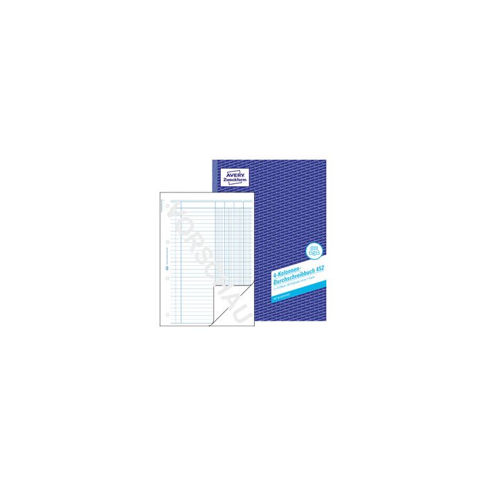 Kolonnen-Durchschreibbuch 452: 4 Kolonnen, A4, mit Blaupapier, 2x50 Blatt, weiß, 1. Blatt gelocht mit Mikroperforation, 2. Blatt ungelocht ohne Mikroperforation zum Verbleib im Buch, mit 1 Blatt Blaupapier
