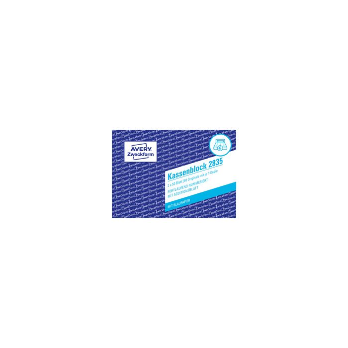 AVERY Zweckform Formularbuch "Kassenblock", 2 x 50 Blatt -------------- für den Markt: D / L / A --------------------100 x 160 mm, mit Additionsblatt, 1. und 2. Blatt bedruckt, fortlaufend nummeriert (2835)