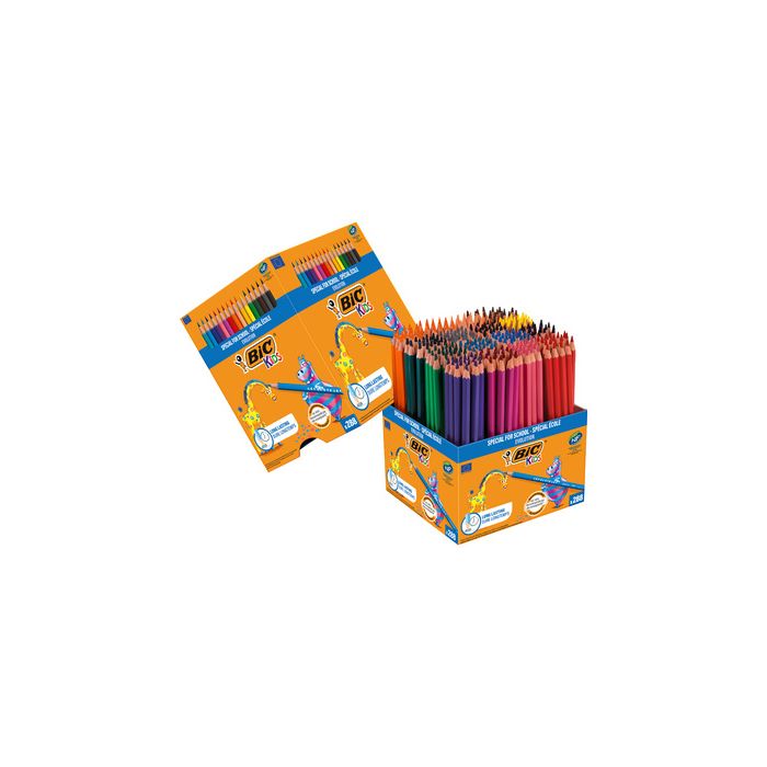 BIC KIDS Crayons de couleur Evolution ecolutions, boîte en carton de 288, épaisseur de mine: 3,2 mm, manche hexagonal, laqué en couleurs, sans bois, en matière recyclée à 50%, mine super résistante, couleurs assorties contenu: 288 Crayons (907901) pas d'échardes de vernis en cas de bris dans une boîte cubique décorative, assorti dans les couleursjaune, lilas, rose vif, orange, bleu clair, vert foncé, vertclair, rose, noir, bleu foncé, chair, gris, jaune foncé et marron garniture scolaire