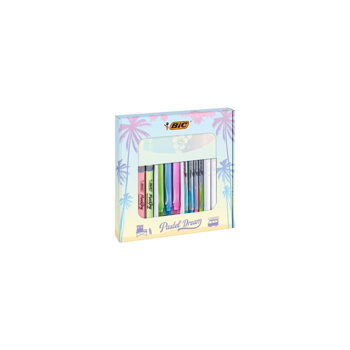 BIC Kit d'écriture "Pastel Dream Kit" avec carnet de notes 16 pièces, dans une pochette carton avec fenêtre, dimen- sions: (L)182 x (P)185 x (H)24 mm, contenu: 4x Fineliner Intensity Medium, 4x stylo à bille Cristal Up Fashion, 4x surligneur Highlighter Grip pastel, 3 stylos à encre gel (992735) Gelocity Quick Dry, 1 carnet de notes