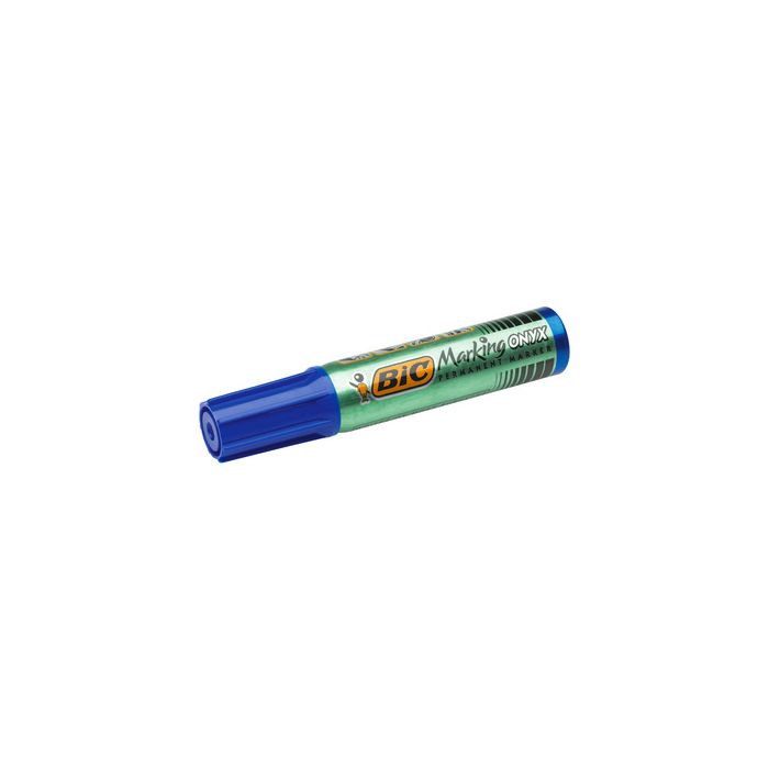 BIC Marqueur permanent Marking Onyx 1481, pointe biseautée, bleu, largeur du tracé: 2,7 - 6,2 mm, corps métallique, capuchon et embout à la couleur de l'encre, encre à base d'alcool, résitant à l'essuyage et à l'eau, sèche rapidementrésistant à la lumière, distance d'écriture: plus de 1 km (8418122 / nouveau: 8418123) inscriptible sur la plupart des matériaux, aussi le carton, verre et plastique