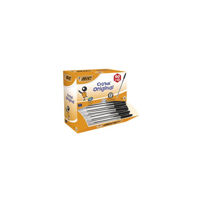 BIC Stylo à bille Cristal Original, VALUE PACK, noir 90+10 GRATUIT, largeur du tracé: 0,32 mm, hexagonal, manche transparent, capuchon et embout à la couleur de l'encre, bille en carbure de tungstène, distance d'écriture: 3 km contenu: 100 pièces (896040 / nouveau: 942911)
