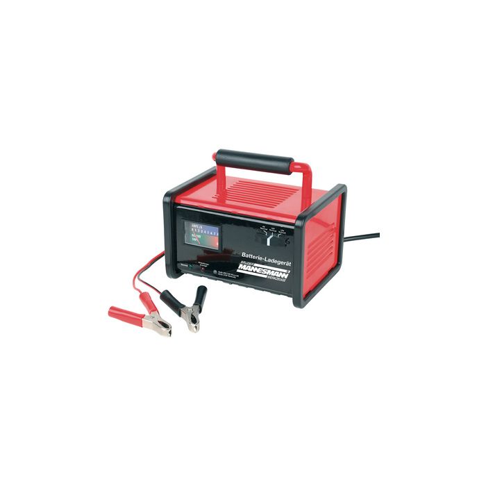 BRÜDER MANNESMANN Chargeur pour batterie de voiture, 8A 6/12V, boîtier en métal avec poignée, pour batteries 6 & 12 Volt, affichage de la charge sur un ampèremètre, avec protection contre l'inversion des pôles, couleur: noir/rougedimensions: (L)204 x (P)198 x (H)176 mm (M12720) pour CH avec adaptateur fixe