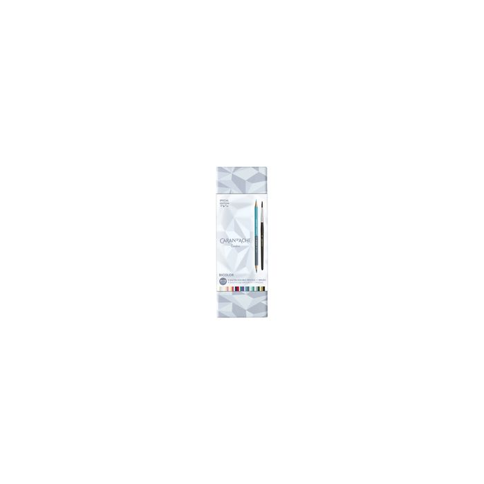 CARAN D'ACHE Crayons de couleur BICOLOR ALPINE FROST, set 9 crayons bicolores aquarellables = 18 couleurs, en bois de cèdre, corps hexagonal, mine tendre et résistante, épaisseur2,8 mm, dans une boîte cadeau en carton contenu: 9 crayons + 1 pinceau, dans une boîte cadeau (CC0999.025)