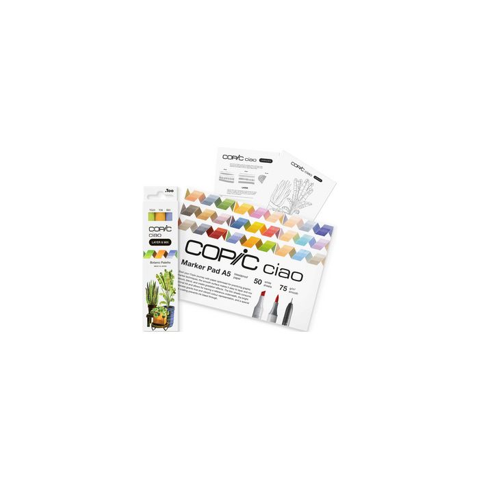 COPIC Marqueur ciao "LAYER & MIX Starter Set", Botanic LE marqueur pour maquettes, esquisses et illustrations, incl. 2 pointes: 1 pointe moyenne + 1 pointe pinceau, encre à base d'alcool, sèche rapidement, miscible, contenu: 3 marqueurs, 1 bloc Marker Pad A5 (220750206) YG-23 (New Leat), Y-38 (Honey), B-63 (Light Hydrangea)