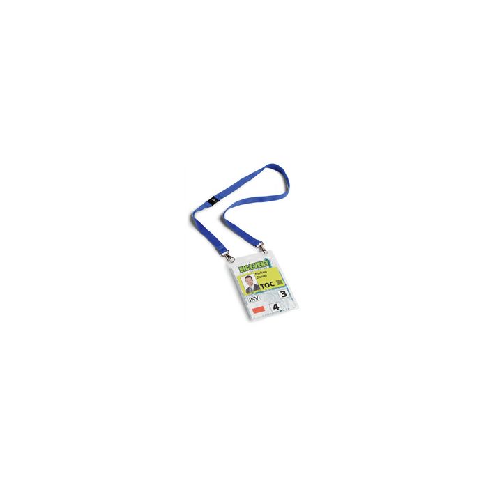 DURABLE Badge évènementiel, avec ruban en tissu, A6 format portrait, ruban en tissu de 20 mm de large, ruban en tissu avec 2 mousquetons et une fermeture de sécurité, sur- face d'inscription extra grande, couleur: bleu foncé contenu: 10 pièces (8525-07)