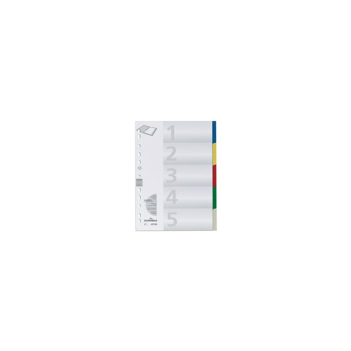 DURABLE Intercalaires en plastique, A4, PP, 5 touches avec onglets colorés, avec page de garde numérotée 1 - 5, uni, dimensions: (l)210 x (h)297 mm, perforation universelle, épaisseur: 0,12 mm (6730-27)