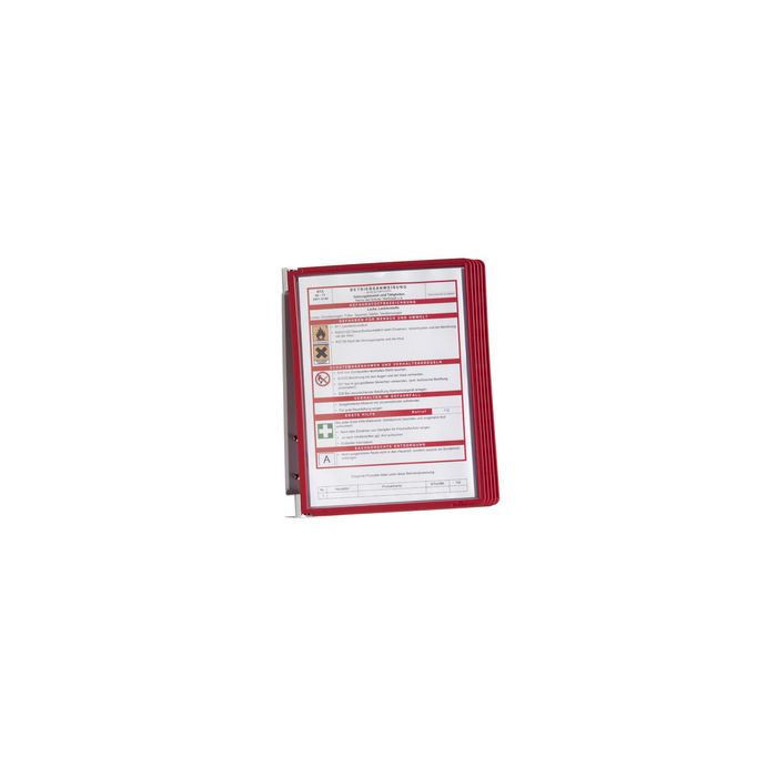DURABLE Système de présentattion VARIO wall 5, kit complet système de consultation murale, support présentoir en métal pupitre en PP, avec mécanisme de chevilles, plaques pochettes format A4 de couleur rouge contenu: 1 support mural + 5 plaques pochettes (5551-03)
