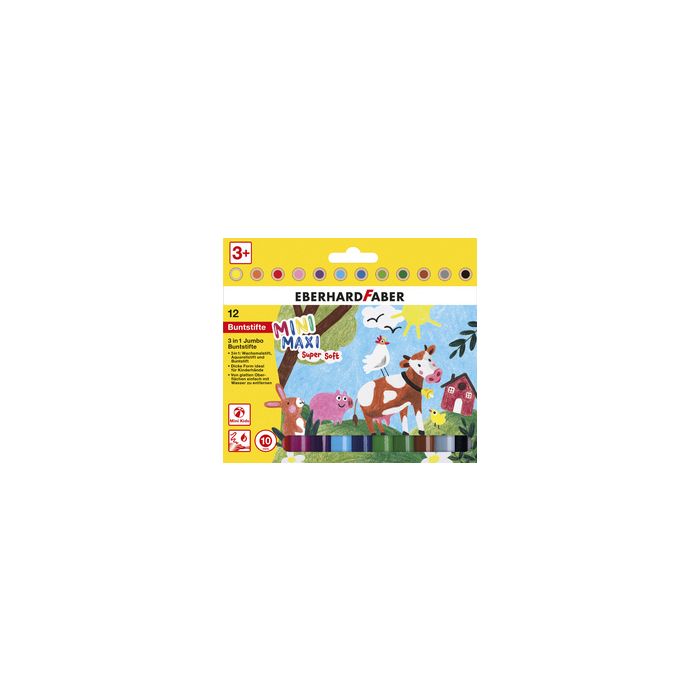 EBERHARD FABER Crayon de couleur 3 en 1 Jumbo MINI MAXI rond, 3 en 1: crayon de couleur, de cire & d'aquarelle, épaisseur de la mine: 10 mm, mine incassable, application Super Soft, facilement lavable à l'eau sur surfaces lisses contenu: 12 crayons dans un étui en carton (518912)