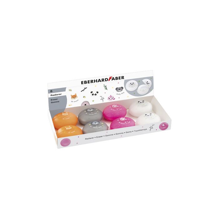 EBERHARD FABER Gomme en plastique Animal, présentoir de 8 pour crayons de papier et de couleur, avec adorables motifs animaliers (panda, koala, licorne et renard), dans une boîteen plastique pratique pour éviter de salir en paquet de 8 pièces (585419) dimensions: (L)43 x (P)43 x (H)13 mm