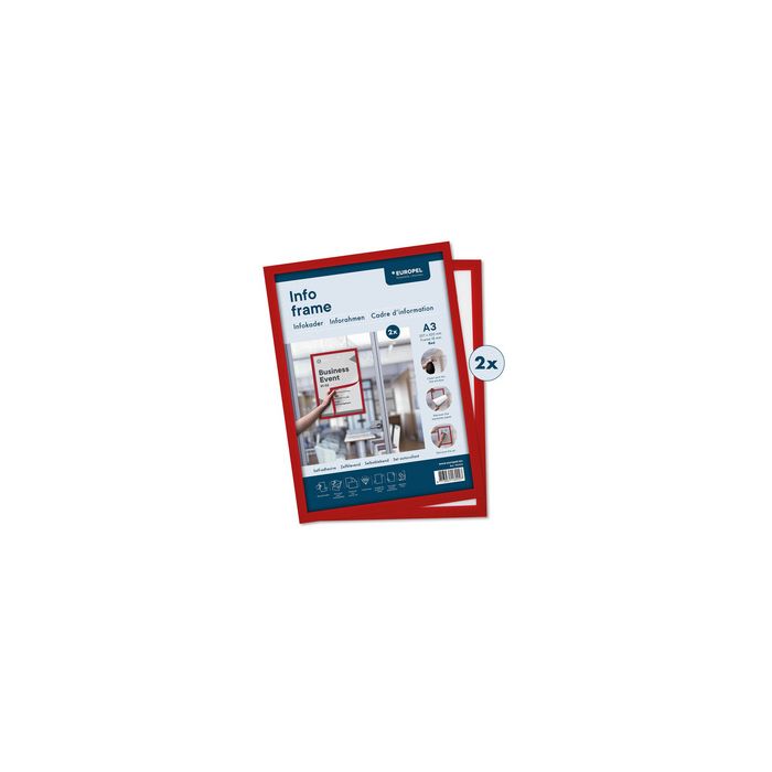 EUROPEL Cadre magnétique INFO FRAME, A3, rouge cadre d'information autoadhésif, changement rapide des documents grâce au cadre magnétique rabattable, s'utilise dans les formats portrait et paysage, contenu : 2 pièces (196002) couleur du cadre visible des 2 côtés, largeur du cadre: 18 mm, dimensions: (L)327 x (H)450 mm