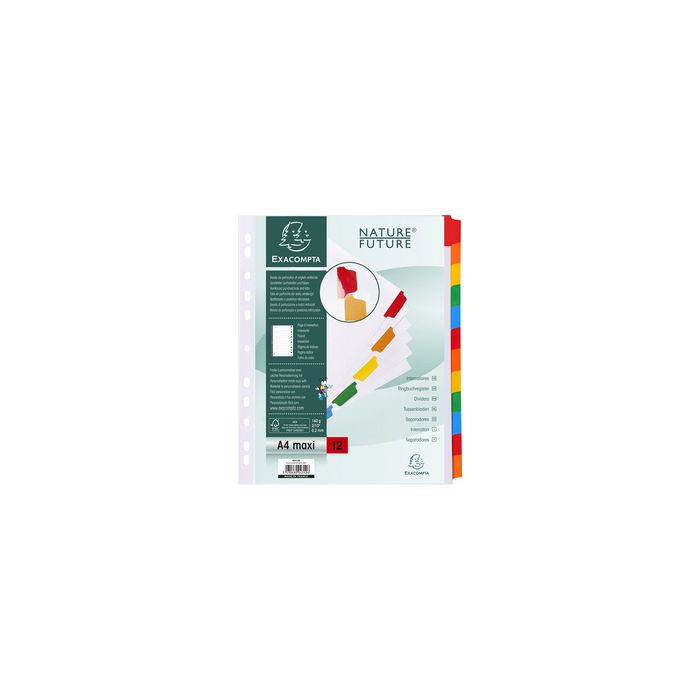 EXACOMPTA Intercalaires en carton, A4 Maxi, 12 touches carte blanche 160 g/m2, uni, touches colorées plastifiées, bande de perforation renforcée, page d'indexation imprimableen paquet de 20 pièces (4312E)