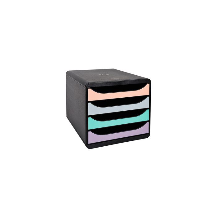 EXACOMPTA Module de classement BIG-BOX Aquarel, 4 tiroirs coloré, boîtier en polystyrène, pour format A4+, tiroirs ouverts avec butée de sécurité, hauteur tiroir : 55 mm, dimensions : (L)278 x (P)347 x (H)267 mm boîtier : noir, tiroirs : pastel brillant (3104296D)