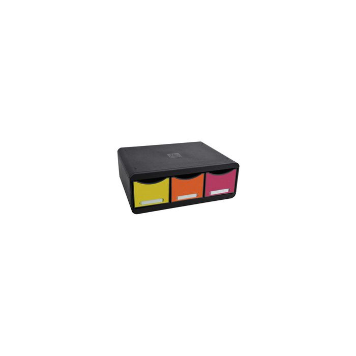 EXACOMPTA Module de classement TOOLBOX MAXI, 3 tiroirs arlequin, boîtier en polystyrène, boîte de rangement et de classement avec 3 tiroirs étroits mais hauts pour petits articles de bureau, dimensions: (L)355 x (T)270 x (H)135 mm porte-étiquettes inclus, boîtier: noir, tiroirs: de couleur (318798D)