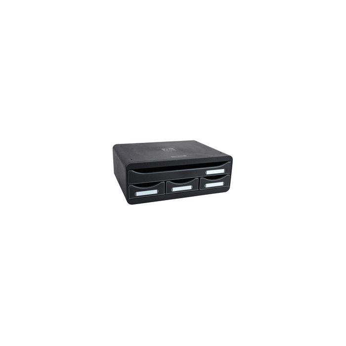 EXACOMPTA Module de classement TOOLBOX MINI, 4 tiroirs, noirboîtier en polystyrène, boîte de rangement et de classement avec 3 tiroirs étroits et 1 tiroir format A4+ Dimensions: (L)355 x (T)270 x (H)135 mm, porte-étiquette boîtier: noir, tiroirs: noir (319714D)
