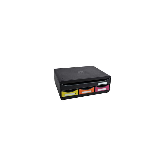 EXACOMPTA Module de classement TOOLBOX MINI, 4 tiroirs, arlequin, boîtier en polystyrène, boîte de rangement et de classement avec 3 tiroirs étroits et 1 tiroir format A4+ dimensions: (L)355 x (T)270 x (H)135 mm, porte-étiquettes boîtier: noir, tiroirs: de couleur (319798D)