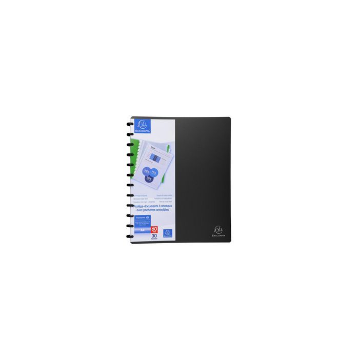 EXACOMPTA Protège-documents, A4, 30 pochettes, noir couverture en polypropylène, opaque, reliure à anneaux, pochettes repositionnables grainées, anneaux noirs dimensions: (L)245 x (H)310 mm (86351E)