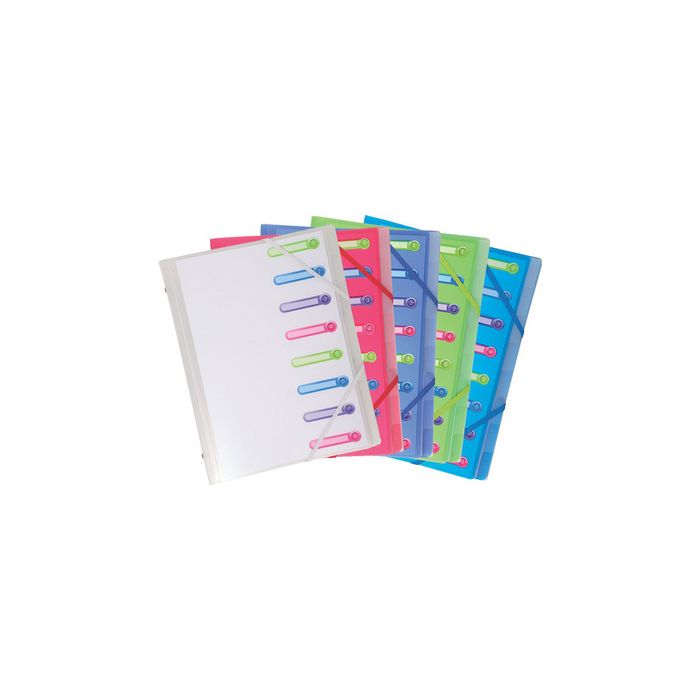 EXACOMPTA Trieur Chromaline, A4, PP, 8 compartiments,assorticouverture en PP recyclé, solidité: 500 microns, avec 3 rabats, pochette transparente A4 en 2ème de couverture, dimensions: (L)240 x (H)320 mm, fermeture à élastiques, en paquet de 10 pièces (56189E) assorti en bleu, cristal, rouge, turquoise, vert