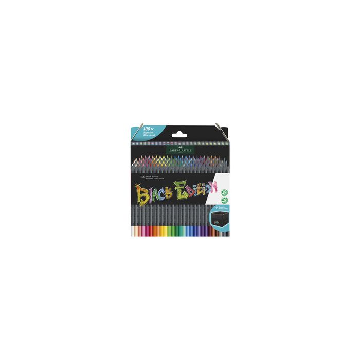 FABER-CASTELL Crayon de couleur Black Edition, étui de 100 triangulaire, en bois noir, mine supersoft pour de superbes effets même sur du papier foncé, mine incassable, applica- tion de couleur extra douce, épaisseur de la mine: 3,3 mm contenu : 100 crayons dans un étui carton (116411)