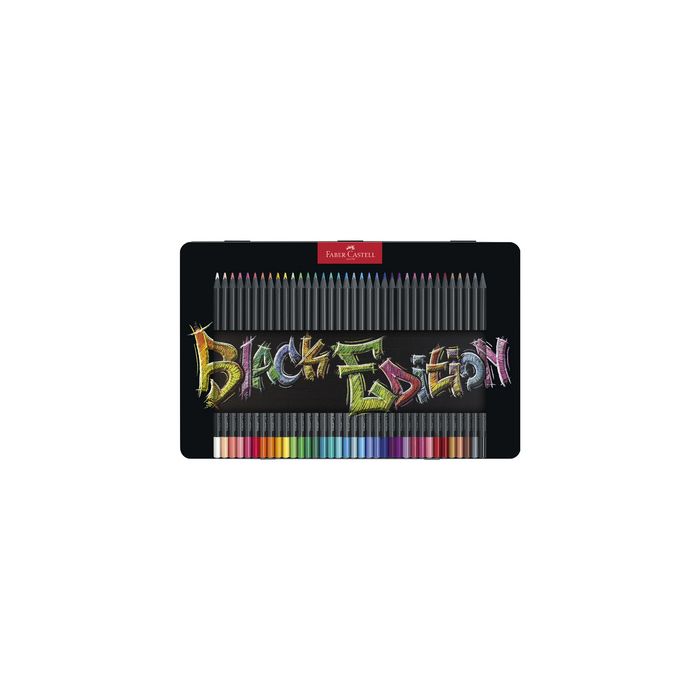 FABER-CASTELL Crayon de couleur Black Edition, étui de 36 triangulaire, en bois noir, mine supersoft pour de superbes effets même sur du papier foncé, mine incassable, applica- tion de couleur extra douce, épaisseur de la mine: 3,3 mm contenu : 36 crayons dans un étui en métal (116437)