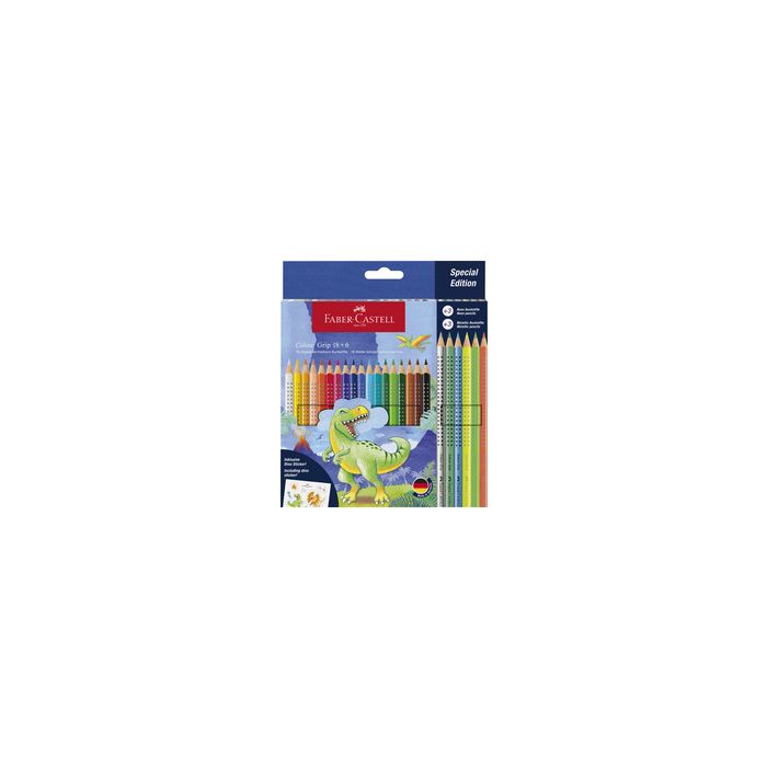 FABER-CASTELL Crayon de couleur Colour GRIP Dino, 18+6 triangulaire, tige couleur, Soft-Grip, longueur: 175 mm, aquarellable, zone pour le nom, épaisseur de mine: 3 mm, contenu: 24 crayons dans étui carton, incl. autocollants (201546) 18 crayons de couleur Colour GRIP couleurs standards 3 crayons de couleur Colour GRIP couleurs métallisées 3 crayons de couleur Colour GRIP couleurs néon