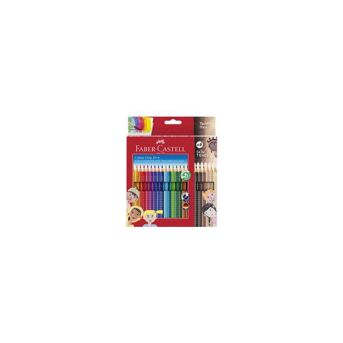 FABER-CASTELL Crayon de couleur Colour GRIP, étui promo triangulaire, laqué en couleur, zone Soft-Grip, longueur: 175 mm, aquarellable, champ pour nom, largeur trait: 3,0 mm,contenu: 24 crayons dans étui carton (112819) 18 crayons de couleur Jumbo GRIP couleurs standard 6 crayons de couleur Jumbo GRIP couleurs chair