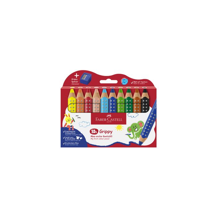 FABER-CASTELL Crayon de couleur Grippy, étui carton de 10 mine jumbo souple, conçu pour les mains d'enfants, profil triangulaire ergonomique, avec picots antidérapants, épaisseur de la mine: 10 mm, testé dermatologiquement contenu: 10 crayons + taille-crayon Grippy (110636) assorti dans les couleurs: jaune, orange, rouge, ton chair, turquoise, bleu foncé, vert clair, vert foncé, marron, noir