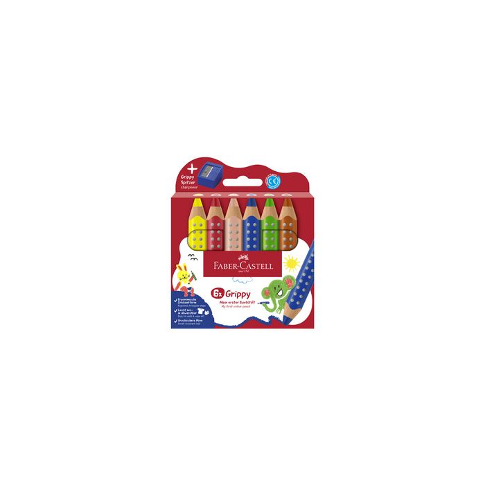 FABER-CASTELL Crayon de couleur Grippy, étui carton de 6 mine jumbo souple, conçu pour les mains d'enfants, profil triangulaire ergonomique, avec picots antidérapants, épaisseur de la mine: 10 mm, testé dermatologiquement contenu: 6 crayons + 1 taille-crayon Grippy (110635) assorti dans les couleurs: jaune, rouge, ton chair, bleu foncé, vert clair, marron