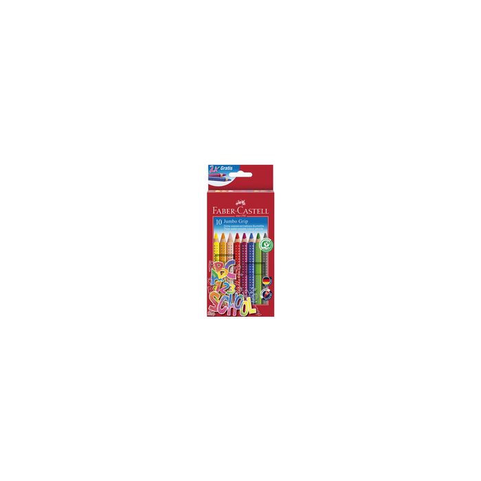 FABER-CASTELL Crayon de couleur Jumbo GRIP, étui promo triangulaire, laqué en couleur, soft grip, longueur: 175 mm,aquarellable, avec zone pour le nom, épaisseur de mine: 5,3 mm contenu: 10 crayons (8 + 2 GRATUITS) (280922) assorti dans les couleurs: jaune cadmium, jaune chrome foncé, géranium clair, bleu cobalt, bleu indanthrène, vert herbe, ocre brûlée, noir