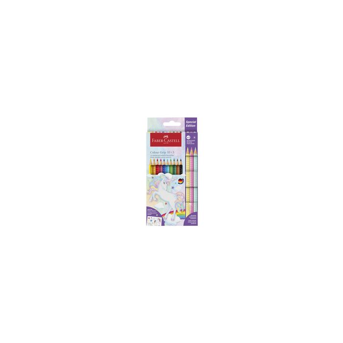 FABER-CASTELL Crayon de couleur triangulaire Colour, 10+3 Colour GRIP licorne, triangulaire, laquage coloré, zone Soft-Grip, longueur: 175 mm, aquarellable, avec porte-nom, épaisseur de la mine: 3,0 mm, contenu: 13 crayons dans un étui carton avec sticker (201542) 10 crayons de couleur Colour GRIP couleurs standard 3 crayons de couleur GRIP SPARKLE couleurs pastel
