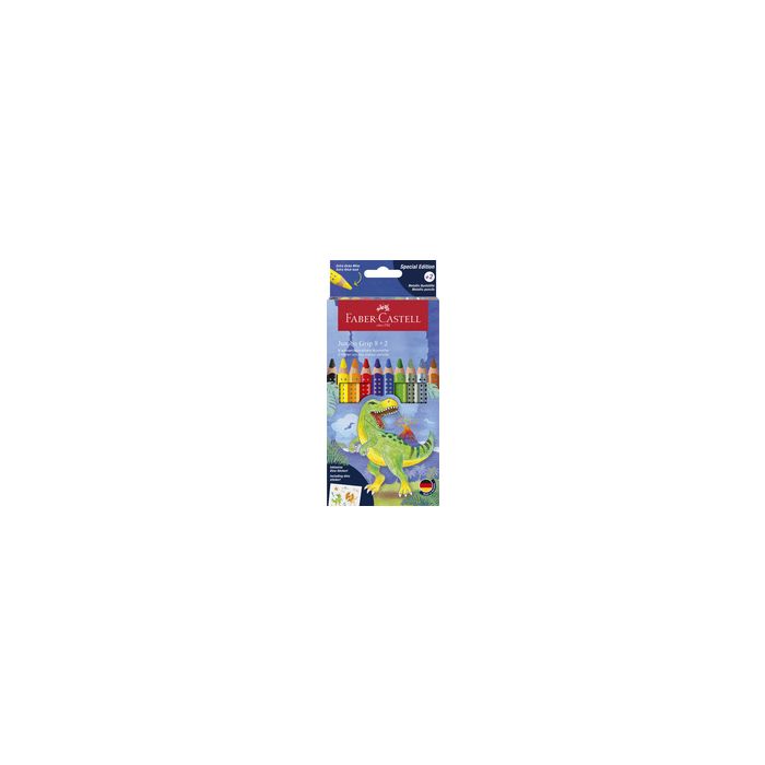 FABER-CASTELL Crayon de couleur triangulaire Jumbo GRIP Dino8+2, tige couleur, Soft-Grip, longueur: 175 mm, aquarellable, zone pour le nom, épaisseur de mine: 5,3 mm, contenu: 10 crayons dans étui carton, incl. autocollants (110922) 8 crayons de couleur Jumbo GRIP couleurs standards 2 crayons de couleur Jumbo GRIP couleurs métallisées