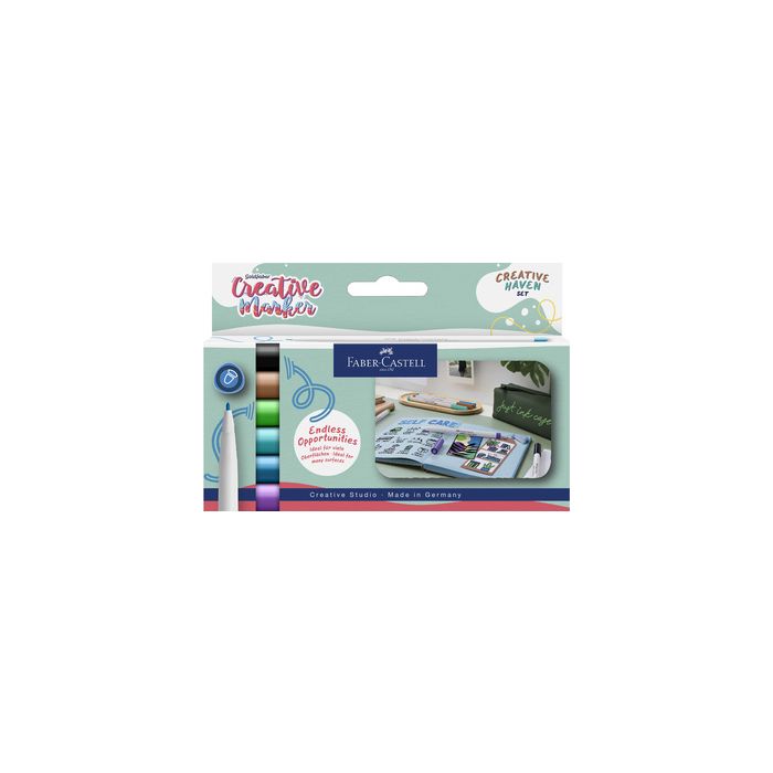 FABER-CASTELL Creative Marker GOLDFABER, étui de 6 étui Creative Haven, encre à base d'eau, sans odeur, résisteaux frottements et aux éclaboussures, ne traverse pas le papier, convient pour papier, carton, verre, plastique, métal, pierre, etc., pointe ogive, largeur du tracé: 1,5 mm (160603)
