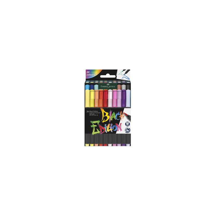 FABER-CASTELL Feutre Black Edition, étui de 20 encre à base de colorant alimentaire, lavable sur la plupartdes tissus, pointe de pinceau souple pour des traits fins etlarges, couleurs lumineuses contenu: 20 feutres dans un étui carton (116452)