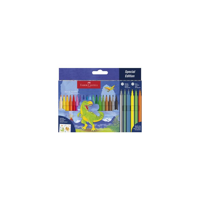 FABER-CASTELL Feutre Dino, étui en carton 18+6 encre à base d'eau, couleurs brillantes, couleurs pastel avec effet scintillant stylé, mine résistante à la pression contenu: 24 feutres, incl. stickers (554222)