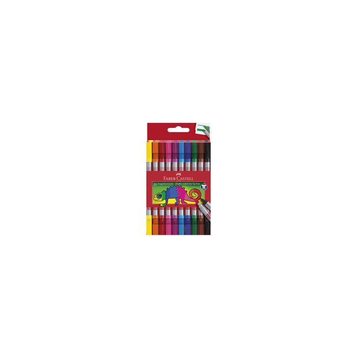 FABER-CASTELL Feutre double pointe, étui de 10 avec pointe large et fine (3-5 / 1 mm), lavable sur la plupart des textiles, encre avec colorants alimentaires à base d'eau, capuchon ventilé contenu: 10 feutres (151110) assorti dans les couleurs: jaune, orange, rouge, rose, violet, bleu clair, bleu foncé, vert, marron, noir