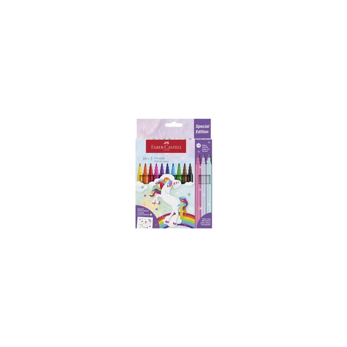 FABER-CASTELL Feutre licorne, étui carton 10+3 encre à base d'eau, couleurs brillantes, couleurs pastel avec effet scintillant stylé, mine résistante à la pression,contenu: 13 feutres, incl. stickers (554213)