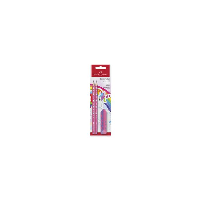 FABER-CASTELL Kit d'écriture Licorne, 3 pièces, rose épaisseur de la mine: env. 2 mm, profil triangulaire ergonomique, mine anti-bris, champ pour le nom, avec motif licorne scintillant et en relief contenu: 2 crayons de papier HB + 1 gomme (111516)