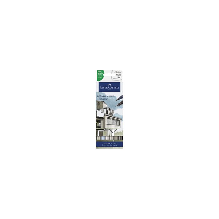 FABER-CASTELL Marqueur Sketch GOLDFABER, étui de 26 architecture, marqueur à base d'alcool avec deux pointes, l'encre sèche vite, indélébile et résistant à l'eau, une application répétée permet de réaliser ombres et profondeur contenu: 6 marqueurs (164807)