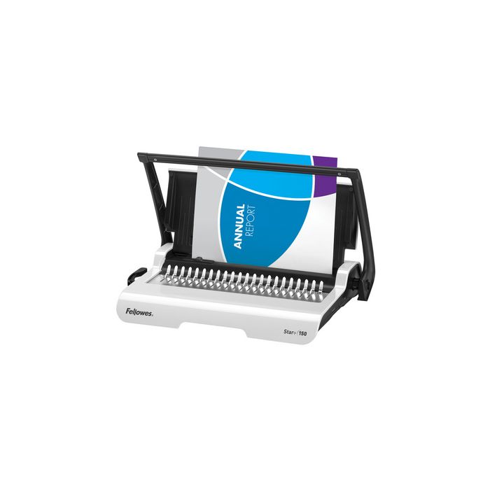 Fellowes Perforelieur Star +150, blanc/noir allant au format A4, capacité de perforation: 12 feuilles, capacité reliure: 150 feuilles, diamètre dos max: 18 mm, poincon manuelle - levier de perforation constant dimensions: (L)448 x (P)280 x (H)80 mm (5627501/CRC56275/ancien:5630501)