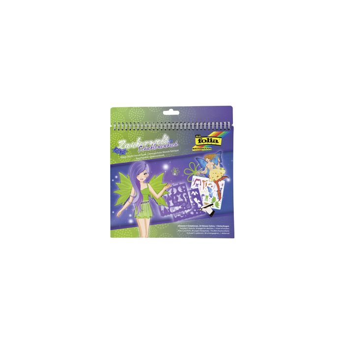 folia Livre pochoir "Monde magique", grand format: 264 x 240 mm, contient 5 pochoirs en plastique, 36 esquisses avec contours, pages en papier, 1 feuille avec stickers, reliure en spirale, couverture rigide (41201)
