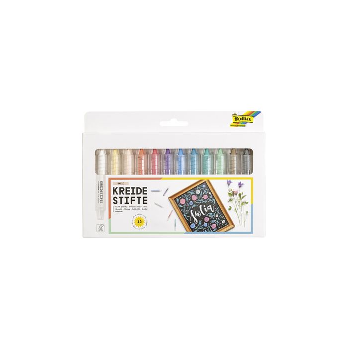 folia Set de crayons craie, assorti, étui de 12 crayons optique craie, assorti dans les couleurs: blanc, jaune, rose, orange, rouge, violet, bleu clair, turquoise, vert, vert clair, marron et gris, à base de craie, peut êtreeffacé avec un chiffon humide (371209)