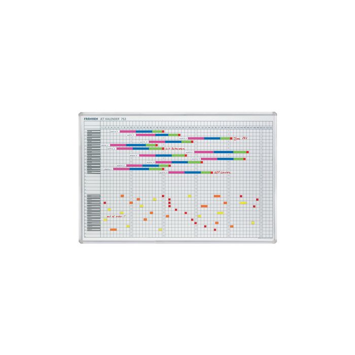 FRANKEN Tableau planning calendrier annuel "JETKALENDAR" format: 900 x 600 mm, répartie en 53 semaines, magnétique, pour plans du personnel ou projets, cadre en aluminium avec coins en plastique, avec auget, matériel de fixation inclus et 3 punaises magnétiques (JK753)