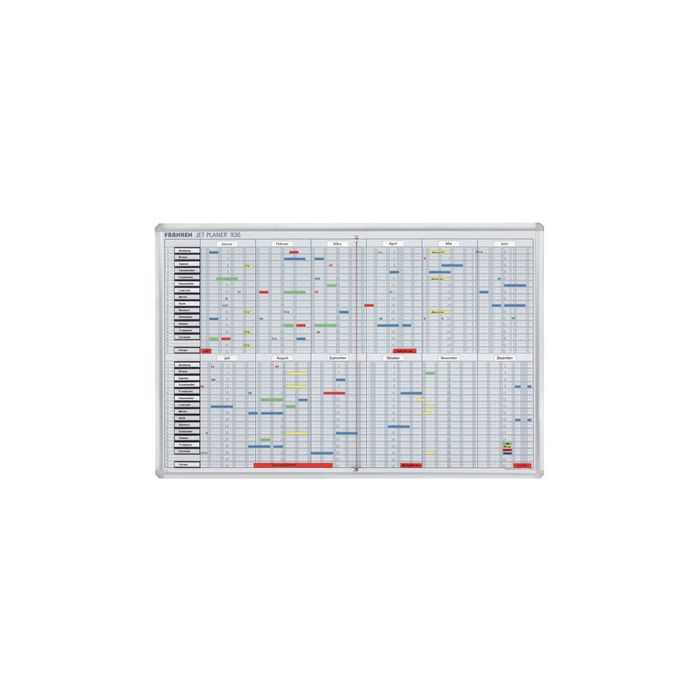 FRANKEN Tableau planning et de projet "Jetplaner" 900 x 600 mm, 32 positions, 12 mois, tableau magnétique, surface laqué, calendrier robuste imprimé, incl. 40 bagdes, autocollant transparent, bandes magnétiques coloréesbande magnétique, 1 marqueur, 1 tableau (SPJ936) Tableau de planning annuel